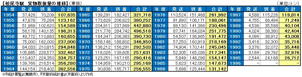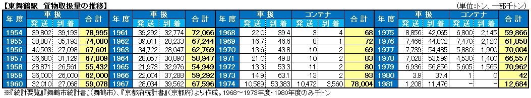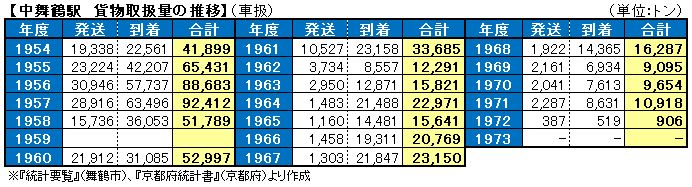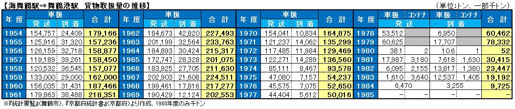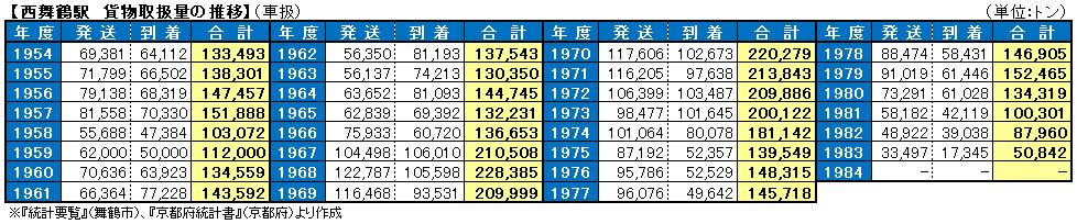 次> ■1.はじめに ■2.舞鶴市内の専用線一覧 ■3.年表 ■4.駅別取扱量(トン) ▼西舞鶴駅 ▼舞鶴港駅 ▼東舞鶴駅 ▼中舞鶴駅 ▼松尾寺駅 ▼舞鶴市内各駅 ■5.品目別取扱量(トン)の推移と輸送体系 ▼木材 ▼鉱石類と石灰石 ▼ガラスとその製品 ▼化学薬品と石灰類 ▼肥料 ▼セメント ▼石炭 ▼コークス ▼石油 ▼鉄鋼 ▼繊維 ▼鮮魚 ▼麦 ■6.最後に |
