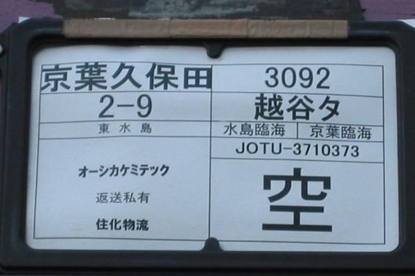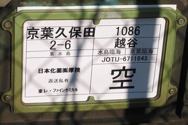 有者】 EXSIF Worldwide, Inc. 【借受者】 三井化学株式会社か? 【輸送品目】 アセトン 【運用区間】 京葉久保田〜黒井 【その他】 かつて前川駅の三井石油化学(株)の専用線からタンク車によるアセトン輸送が行われていた。そのためこのISOタンクコンテナ輸送も三井化学(株)が発 荷主では ないかと想像している。 一方の着荷主は、新井駅の(株)ダイセルではないだろうか。 2012.7.21作成