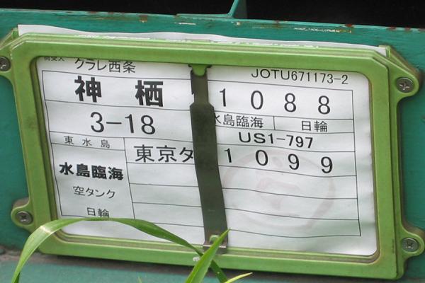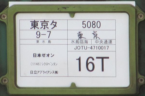 有者】 日本石油輸送株式会社 【借受者】 日本ゼオン株式会社 【輸送品目】 シクロペンタン 【運用区間】 東水島〜東京(タ)(荷票写真はこちら) 【その他】 着荷主は日立アプライアンス(株)であった。 2012.9.16作成
