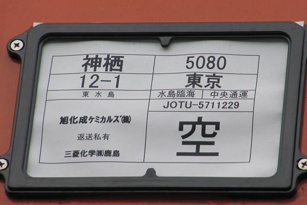 有者】 日本石油輸送株式会社 【借受者】 住友化学株式会社 【輸送品目】 エチレン酢酸ビニル 【運用区間】 京葉久保田〜東水島(荷票の写真はこちら) 【その他】 到着荷主は、オーシカケミテック(株)である。同社は合成樹脂接着剤の製造・販売を行っており、岡山県倉敷市海岸通り3-9-1に水島工場がある。 ![]() 2012.7.1作成