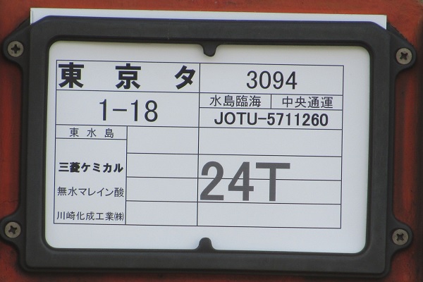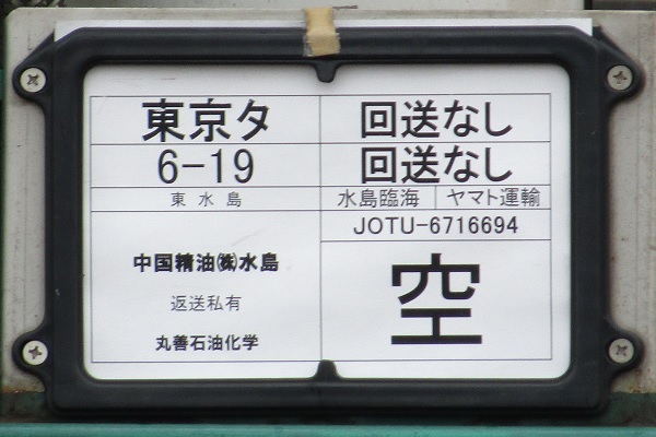 有者】 日本石油輸送株式会社 【借受者】 丸善石油化学株式会社 【輸送品目】 ジシクロペンタジエン専用 【運用区間】 東京(タ)〜東水島(荷票の写真はこちら) 【その他】 発荷主は丸善石油化学(株)、着荷主は中国精油(株)水島工場であった。 丸善石油化学(株)は、高純度ジシクロペンタジエンの販売を行っており、千葉工場で製造している模様。 2019.7.14作成