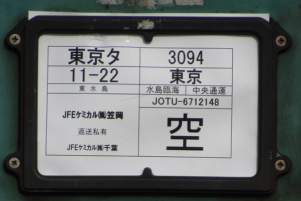 有者】 日本石油輸送株式会社 【借受者】 JFEケミカル株式会社 【輸送品目】 フェノレート 【運用区間】 東京(タ)〜東水島(荷票の写真はこちら) 【その他】 JFEケミカル(株)千葉からJFEケミカル(株)笠岡への自社内輸送である。 2017.11.28作成
