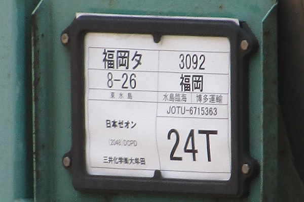 有者】 日本石油輸送株式会社 【借受者】 日本ゼオン株式会社 【輸送品目】 ジシクロペンタジエン専用 【運用区間】 東水島〜福岡(タ)(荷票の写真はこちら) 【その他】 発荷主は日本ゼオン(株)、着荷主は三井化学(株)大牟田であった。 2019.9.16作成