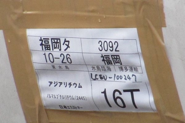 有者】 FMC 【輸送品目】 ノルマルブチルリチウム専用 【運用区間】 東水島〜福岡(タ)(荷票の写真はこちら) 【その他】 発荷主はアジアリチウム(株)、着荷主は日本エラストマー(株)である。 アジアリチウムは、本荘ケミカル(株)の子会社で香川県香川郡直島町に直島工場がある。日本エラストマーは、昭和電工(株)の大分石油化学コンビナート 内に大分工場がある。 2018.12.2作成