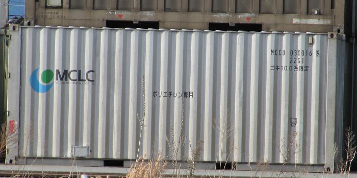 有者】 三菱化学物流株式会社 【輸送品目】 ポリエチレン専用 【運用区間】 東水島〜盛岡(タ)・静岡貨物か? 【その他】 住友化学(株)や(株)プライムポリマーがポリエチレンやポリプロピレンなどの鉄道貨物輸送にISO規格の有蓋コンテナを導入しているのに比べ、三菱化 学グ ループの合成樹脂の鉄道貨物輸送は相対的にISO規格のコンテナの導入が遅れている印象がある。しかし全く無いということではなく、このようなコンテナを 目にすることがある。 2012.7.8作成