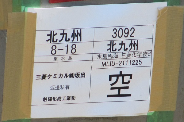 有者】 株式会社日陸 【借受者】 三菱瓦斯化学株式会社 【輸送品目】 MXDA 【運用区間】 東水島〜福岡(タ)(荷票の写真はこちら) 【その他】 三菱瓦斯化学(株)は、水島工場でMXDA(メタキシレンジアミン)を製造している。MXDAはエポキシ樹脂硬化剤、ポリアミド(MXナイロン)、イソシアネートなどに使われ、いずれも世界的に需要は好調なため、 2011年3月に年間製造能力を5,000トン増の25,000トンに増強した。尚、同社は新潟工場でもMXDAを製造しており、生産能力は年産 30,000トンである。 着荷主は、三井化学(株)大牟田工場である。同工場はイソ シア ネート工場があるため、その原料としてMXDAは使用されているのであろう。 2016.4.2作成