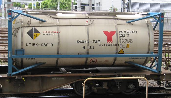 有者】 みなと運送株式会社 【輸送品目】 液体苛性ソーダ専用 【運用区間】 不明 【その他】 みなと運送(株)は鹿島臨海工業地域を拠点とする物流会社である。鉄道貨物輸送としては、塩化ビニル樹脂専用のUT20A形式を所有することで有名であ る。 ISOタンクコンテナでは珍しい液体苛性ソーダ専用である。信越化学工業(株)が荷主であろうか? 2015.6.27作成