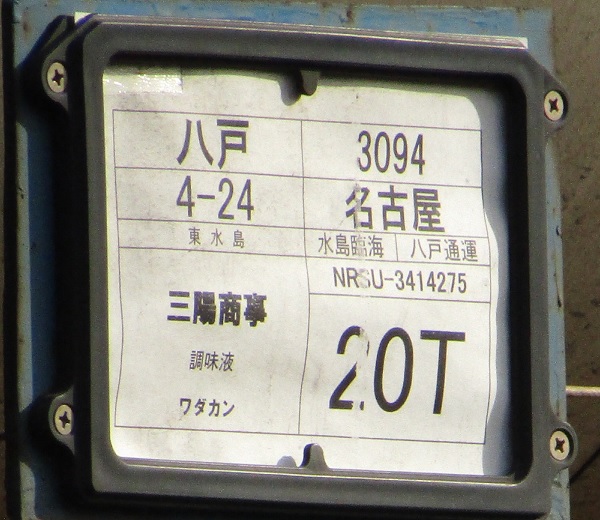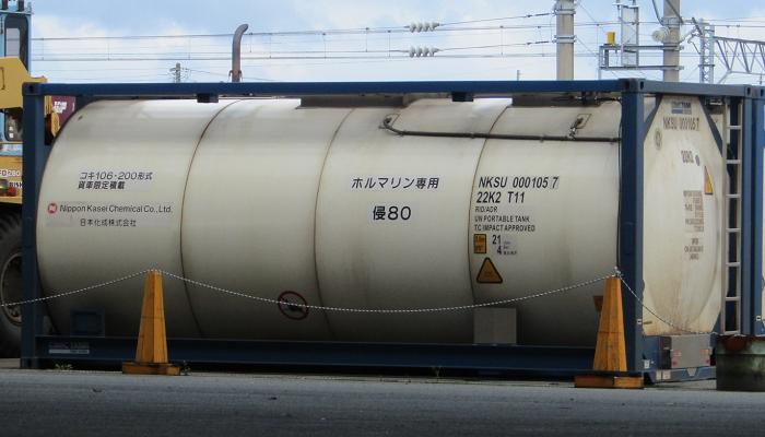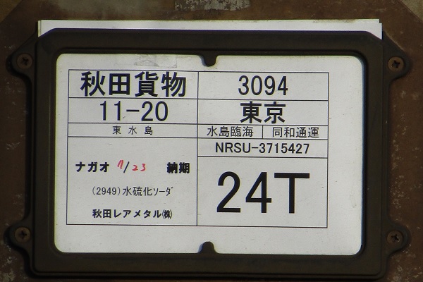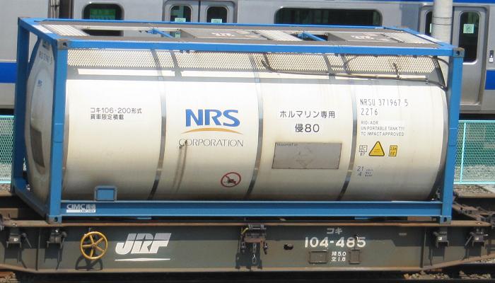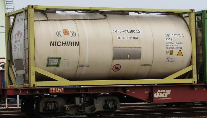 有者】 日本化成株式会社 【輸送品目】 ホルマリン専用 【運用区間】 小名浜〜秋田貨物 【その他】 2015年2月から接着剤の原料となるホルマリンの輸送を小名浜〜秋田貨物間で鉄道にシフトした。納入先は秋田の建材メーカーである。 (参考文献:『Monthlyかもつ』2016年4月号) 秋田貨物駅構内には、ホルマリン専用のISOタンクコンテナが多数留置されており、日本化成(株)以外からの到着もあるのかもしれない。 2016.10.18作成