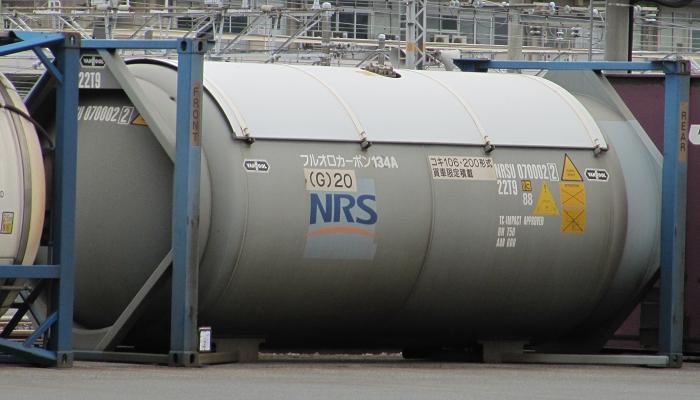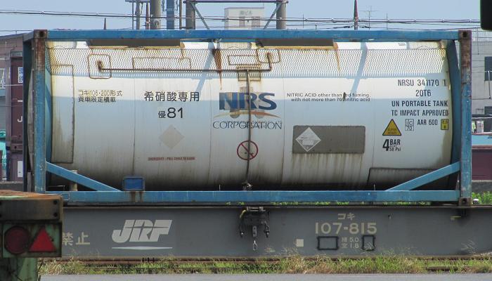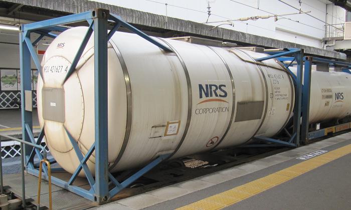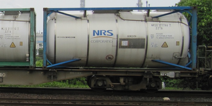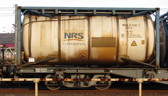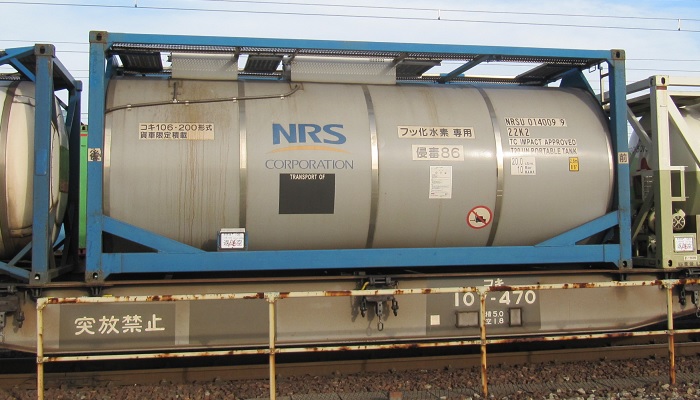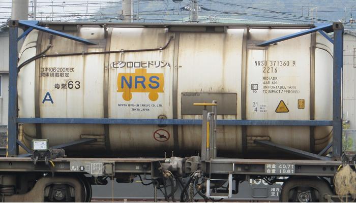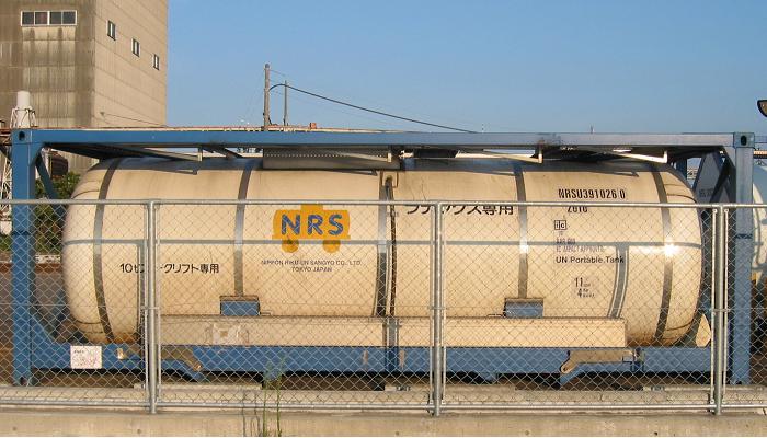 有者】 株式会社日陸 【借受者】 セントラル硝子株式会社と思われる 【輸送品目】 無水フッ化水素酸専用 【運用区間】 新南陽〜東京(タ) 【その他】 セントラル硝子(株)はフッ化水素酸(無水品、希釈品)の製造を行っている。同社web サイトの無水フッ化水素酸の荷姿には、ISOタンクコンテナの写真が載せられており、形式番号は不鮮明ながらNRSU014002_0と読める気 がする。 2016.1.10作成