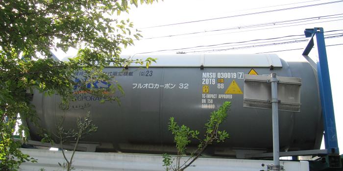 有者】 株式会社日陸 【借受者】 ダイキン工業株式会社 【輸送品目】 フルオロカーボン 32 【運用区間】 梅田・大阪(タ)〜越谷(タ) 【その他】 ダイキン工業(株)化学事業部の淀川製作所と鹿島事業所はフルオロカーボンを同社草加事業所に供給している。淀川製作所からの供給は以前より5トンタンクコンテナで鉄道輸送していたが、コンテナの老朽化やコスト 面から一時トラック輸送へと切り替えていたが、ISOタンクコンテナによる梅田〜越谷(タ)間の鉄道輸送に再度シフトした。3個の専用ISOタンクコンテ ナを運用して年間数百トンの輸送を見込んでいる。 草加事業所は同社の静岡以東の東日本地区の物流拠点で、年間数千トンのエアコンメンテナンス用フルオロカーボンガスを小型ガスボンベに詰め替えて工事店 等に納入する。冷媒用のフルオロカーボンガスは、淀川製作所から届くフルオロカーボンガス32と鹿島事業所から陸送したフルオロカーボンガス125を混合 してできるフルオロカーボンガスR410Aを使う。 (参考文献:『JR貨物ニュース』2009年12月15日号) 2012.7.16作成