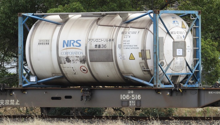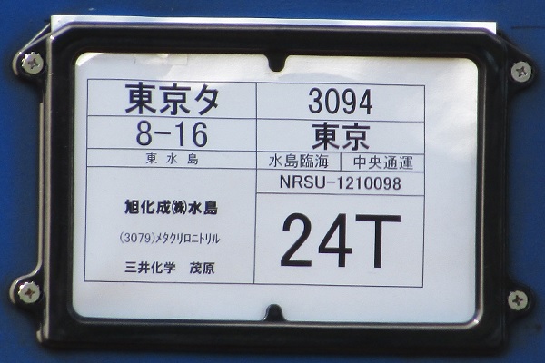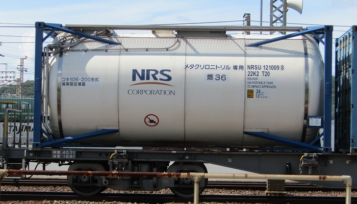 有者】 株式会社日陸 【借受者】 旭化成株式会社 【輸送品目】 メタクリロニトリル専用 【運用区間】 東水島〜東京(タ)(荷票の写真はこちら) 【その他】 発荷主は旭化成(株)水島製造所、着荷主は三井化学(株)茂原分工場である。 メタクリロニトリル(MAN)は、旭化成が1984年に世界で初めて本格量産を開始したモノマー。活性ビニル基とニトリル基、側鎖にメチル基を持つ特徴 ある化合物で、ポリマー用途、中間体原料用途等に広く利用されている。 2017.8.20作成