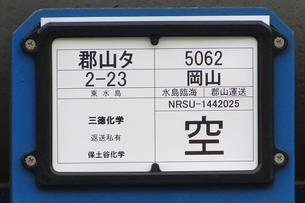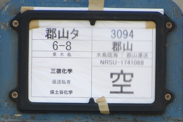 有者】 日本陸運産業株式会社 【借受者】 保土谷化学工業株式会社 【輸送品目】 過酸化水素水 【運用区間】 郡山(タ)〜東水島(荷票の写真はこちら) 【その他】 着荷主は三徳化学工業(株)であった。 同社は、東広島市高屋台に広島工場があり、高純度過酸化水素水を製造している。 2019.7.14作成