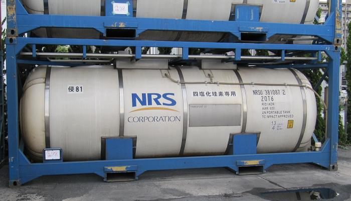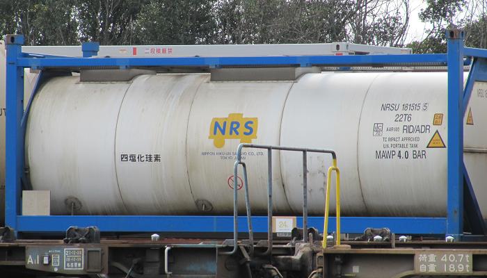 有者】 株式会社日陸 【借受者】 信越化学工業株式会社と思われる 【輸送品目】 四塩化珪素 【運用区間】 神栖〜黒井と思われる 【その他】 信越化学工業が所有するUT13C-8011と 同様な運用と思われる。 四塩化珪素は信越化学工業(株)直江津工場のシリコーン製造過程で発生する。これを原料に同社鹿島工場では合成石英を製造しているものと思われ、ISO タン クコンテナは、同社の工場間輸送に用いられていると考えられる。 2015.8.1作成