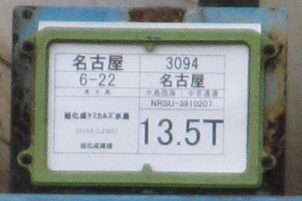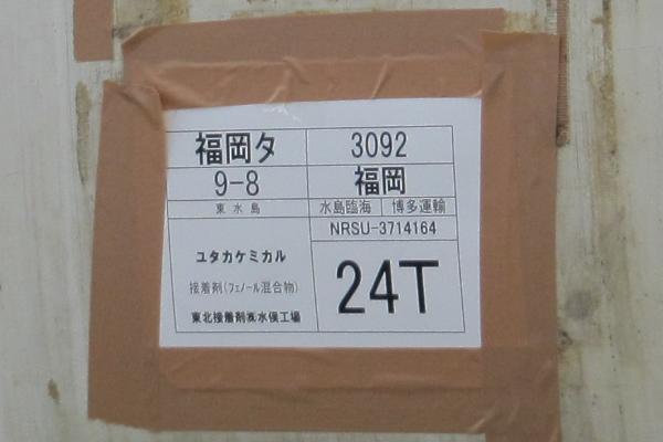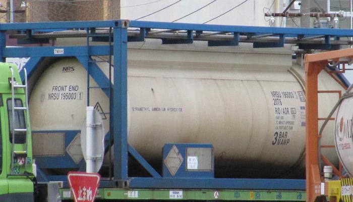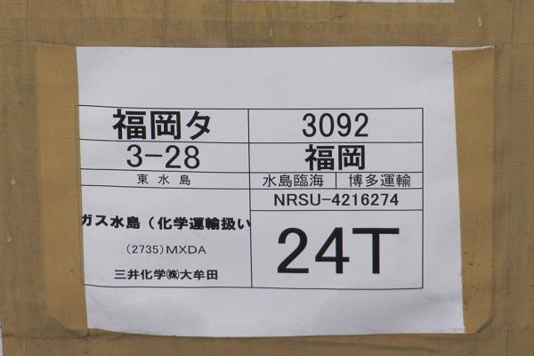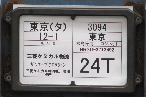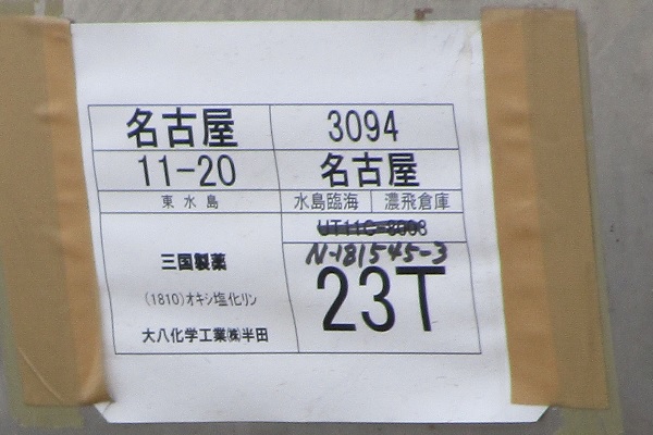 有者】 株式会社日陸 【借受者】 株式会社トクヤマ 【輸送品目】 テトラメチルアンモニウムヒドロキシド 【運用区間】 新南陽〜名古屋(タ)と思われる 【その他】 荷票差しに「トクソーSD」と書かれた紙が差し込んであった。トクソーSDシリーズは、(株)トクヤマがICケミカル/洗浄事業とし手掛けるポジ型フォ トレ ジスト用現像液のブランドで、各種レジストの現像や電子デバイス等のアルカリ洗浄剤として使用される。 一般名称は、テトラメチルアンモニウムヒドロキシド(TMAH)である。 (同 社webサイトを参照) 2012.8.5作成