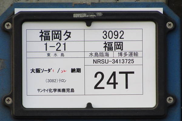有者】 株式会社日陸 【借受者】 三國製薬工業株式会社 【輸送品目】 オキシ塩化リン 【運用区間】 東水島〜福岡(タ) 【その他】 着荷主は不明である。 2017.8.20作成