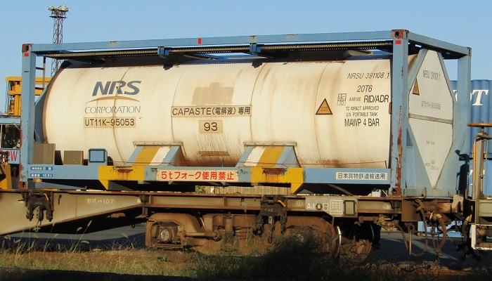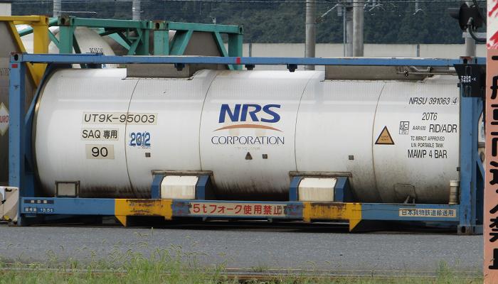 有者】 株式会社日陸 【借受者】 四国化成工業株式会社と思われる 【輸送品目】 二硫化炭素専用 【運用区間】 不明 【その他】 1990年代より安治川口駅を拠点に関西化成品輸送(株)所有のUT7C-5006、UT7C-5010の 二硫化炭素専用のタンクコンテナが運用されている。 その置き換え用なのか、ISOタンクコンテナが登場した。 2018.12.2作成