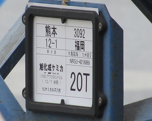 有者】 株式会社日陸 【借受者】 旭化成株式会社 【輸送品目】 アクリロニトリル専用 【運用区間】 東水島〜福岡(タ)(荷票の写真はこちら) 【その他】 発荷主は旭化成(株)、着荷主はKJケミカルズ(株)八代工場で ある。 同工場は(株)興人 八代工場として長い歴史を誇ったが、2014年4月に化成品部門をKJケミカルズ(株)として分離、星光PMC(株)のグループ会社として再発足した。 2021.12.11作成