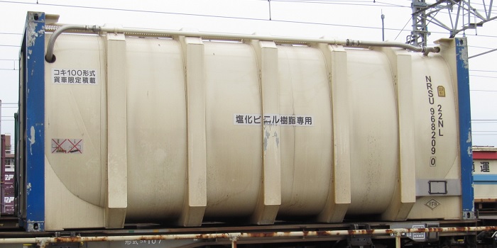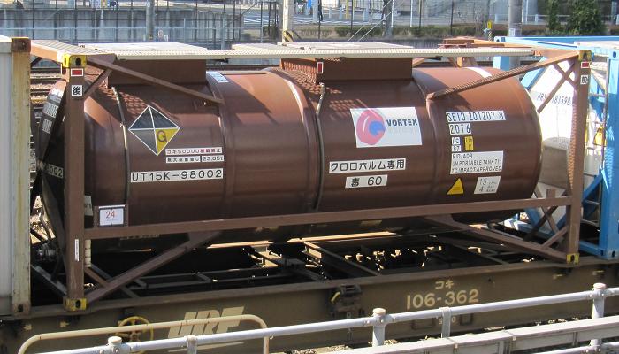 有者】 不明 【借受者】 株式会社ボルテックスセイグン 【輸送品目】 クロロホルム専用 【運用区間】 黒井〜神栖と思われる 【その他】 かつて信越化学工業(株)所有 のタ キ9000形式(クロロホルム専用)が黒井〜奥野谷浜で運用されていたため、その輸送がコンテナ化されたものと予想している。実際、黒井と神栖の両駅でこ のコンテナを目撃している。 タキ車による輸送が廃止され た後は、ローリー輸送に転換され、それがコンテナ化によって再び鉄道輸送にシフトしたのではないか。 尚、信越化学工業は直江津工場で付近で産出する天然ガス、塩素、メタノール、塩酸を原料にクロロホルムを製造している。 またクロロホルムは、フッ素樹脂の反応用原料に用いるとのことで、ダイキ ン工業(株)鹿島製作所が着荷主かもしれない。 2015.2.22作成 2016.7.4訂補
