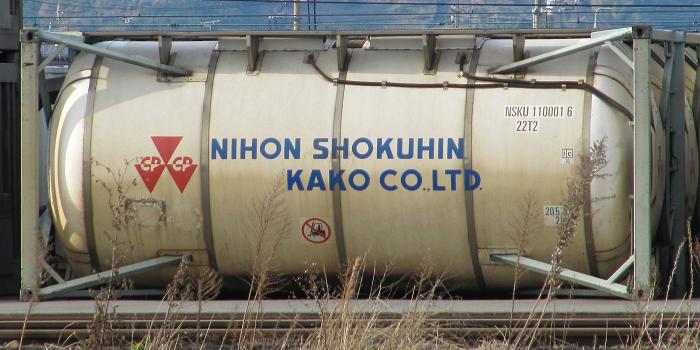 有者】 日本食品化工株式会社 【輸送品目】 液糖 【運用区間】 静岡貨物〜札幌(タ) 【その他】 この輸送は国土交通省が行った「平成15年度環境負荷の小さい物流体系の構築を目指す実証実験」の二次募集で認定された実証実験である。 従来は富士〜千歳間のトラックとフェリーで行われていた輸送をISOタンクコンテナによる鉄道貨物輸送に転換したものである。年間の貨物量は3,000 トンで実験期間は2003年12月中旬〜2004年12月中旬の1年間であったが、引き続き本格導入されたものと思われる。 (※国土交通省 webサイト参照) このコンテナはその後も名古屋(タ)〜札幌(タ)のコンテナ列車で目撃しており、引き続き北海道向け輸送に使用されている模様。 2012.7.8作成 2015.2.22訂補