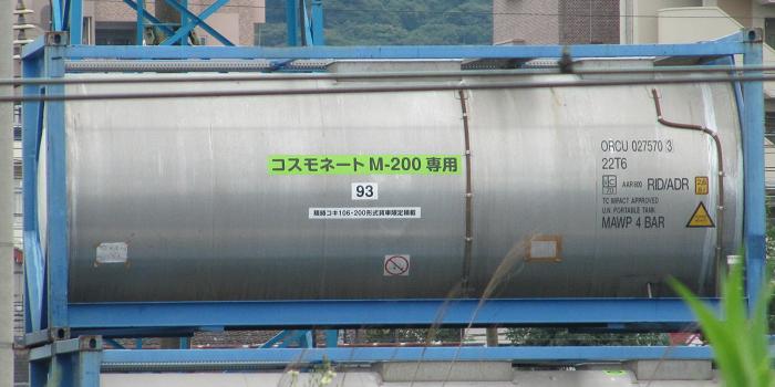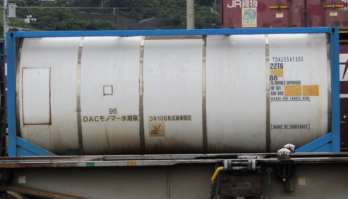 有者】 日本コンセプト株式会社 【使用者】 三菱瓦斯化学株式会社と思われる 【輸送品目】 ジメチルアセトアミド専用 【運用区間】 新潟(タ)〜名古屋(タ) 【その他】 三菱瓦斯化学(株)はジメチルアセトアミド(DMAC)を 新潟 工場で生産しており、このコンテナは同社向けの輸送と思われる。DMACは極性溶媒として有機合成化学で広く用いられるため、着荷主の推定は困難である。 2015.10.11作成