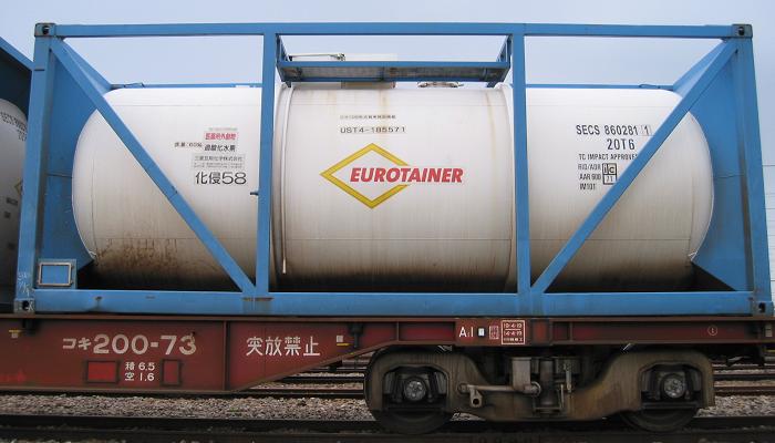 有者】 EUROTAINER 【借受者】 三菱瓦斯化学株式会社 【輸送品目】 過酸化水素 【運用区間】 南四日市(→四日市)〜東京(タ)・福岡(タ) 【その他】 三菱瓦斯化学(株)四日市工場は過酸化水素をタムやタサなどのタンク車を用いて輸送を行っていたが、2003年1月下旬にタンク車で大牟田駅着だった同 社佐 賀製造所向けを福岡(タ)着に、同年2月に相模貨物駅着だった同社山北工場向けを東京(タ)着に変更の上、ISOコンテナに転換された。 当初はタンク車時 代同様に専用線にコキが入線して発送されていたが、2007年に道路工事に伴い専用線が廃止され、四日市駅発送に変更された。 (拙web「専 用線コンテナ入線:南四日市駅(MGC四日市工場)」を参照) 2013.1.13作成