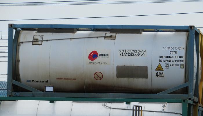 有者】 不明 【借受者】 株式会社ボルテックスセイグン 【輸送品目】 メチレンクロライド(ジクロロメタン) 【運用区間】 不明 【その他】 メチレンクロライドは実用上不燃性で、強力な溶解力と高い安定性を持つ有機溶剤であり、樹脂製造溶剤、塗料剥離剤など、さま ざまな用途で幅広く使用される。別名は、塩化メチレン、ジクロロメタン、ジクロルメタン、メチレンジクロライドである。 メチレンクロライドは信越化学工業(株)直江津工場で製造 され、同社はかつてUT1形式タンクコンテナで塩化メチレン専用を所有していた。 2016.7.27作成