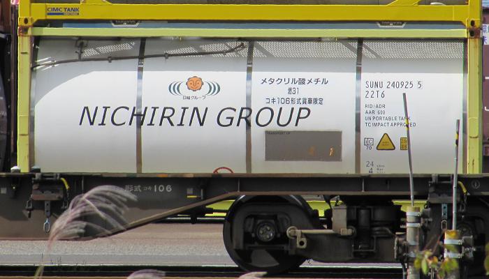 有者】 株式会社日輪 【借受者】 株式会社クラレ 又は 三菱瓦斯化学株式会社 【輸送品目】 メタクリル酸メチル 【運用区間】 不明 【その他】 (株)クラレと三菱瓦斯化学(株)はそれぞれ新潟にある製造拠点でメタクリル酸メチルを生産している。そのためこのコンテナ は両 社の どちらかが荷主と思われる。 2015.10.11作成