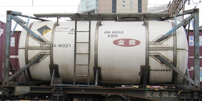 有者】 全農物流(株) 【輸送品目】 生乳 【運用区間】 八戸貨物〜隅田川 【その他】 全農青森県本部は、年間約8万トンを主に関東方面へ出荷している。(株)エーコープライン盛岡営業所は2002年秋から、八戸貨物〜隅田川間で生乳の鉄 道輸送を開始した。ローリー輸送からの転換。東北町の冷却処理施設から茨城の乳業メーカーに納入する月間850トンを、毎日2個のISOタンクコンテナを 用いて鉄道で運ぶ。同社では今回5個のISOタンクコンテナを製造した。 (参考文献:『JR貨物ニュース』2003年7月1日号、3面) 2016.10.18作成