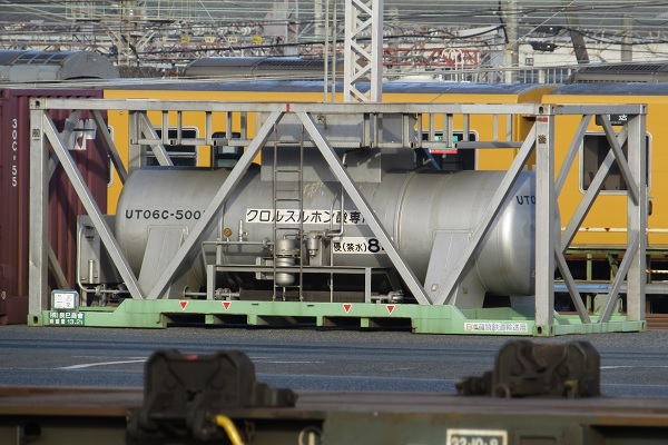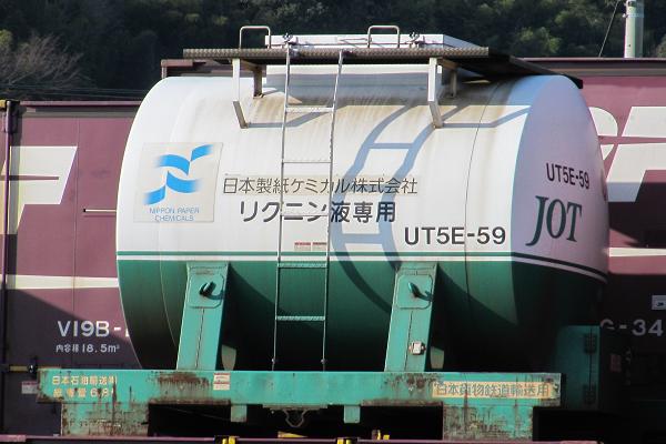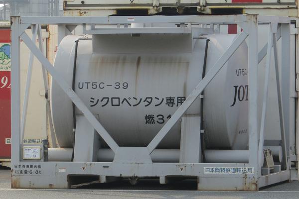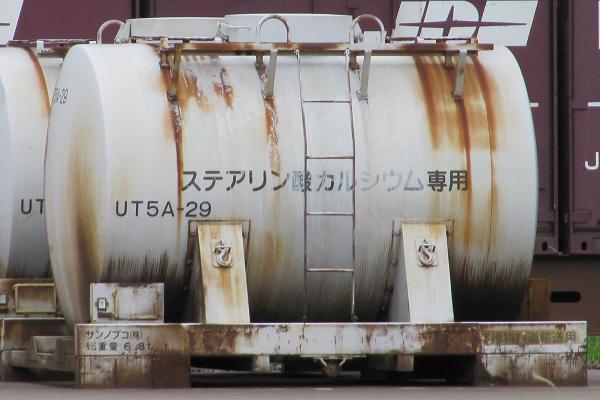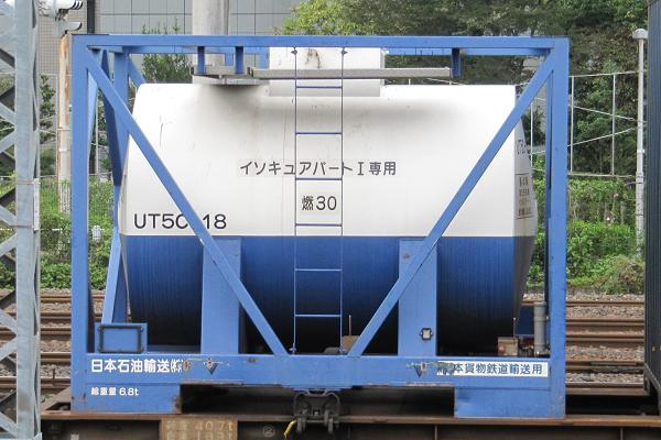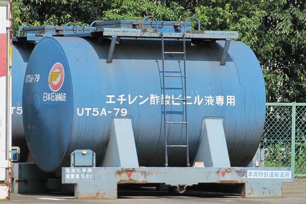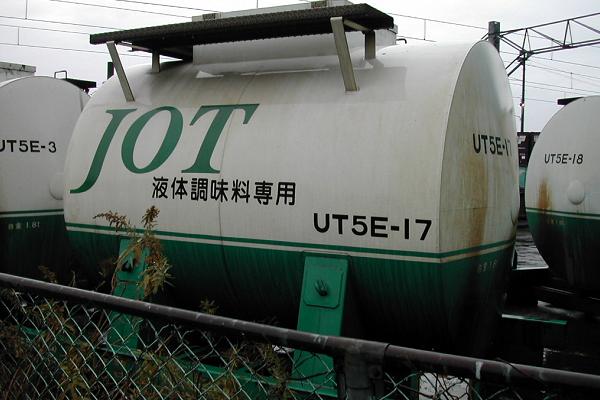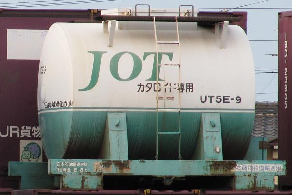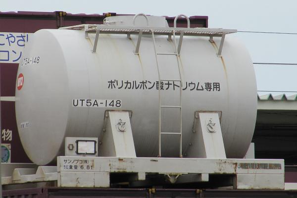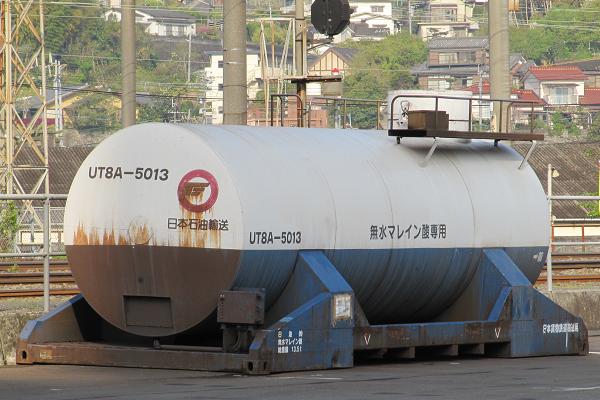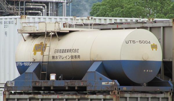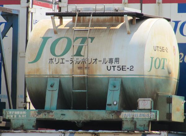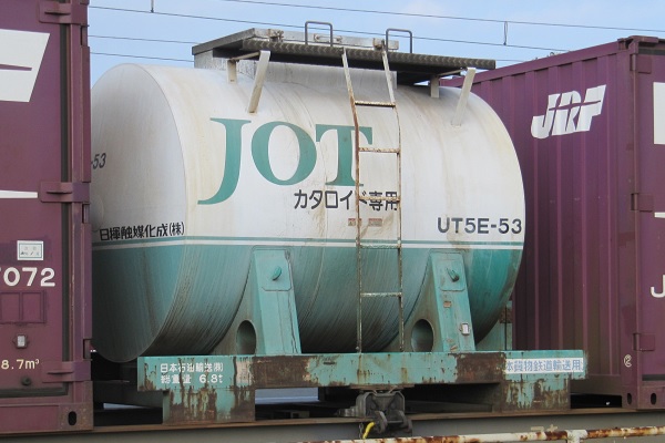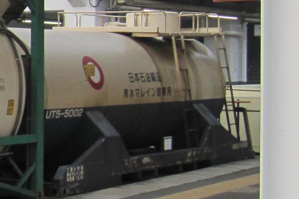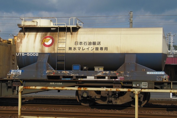 有者】 日本石油輸送株式会社 【借受者】 三菱化学株式会社 【輸送品目】 無水マレイン酸専用 【運用区間】 東水島〜神栖 【その他】 筆者は荷票を捉えることに失敗してしまったが、f.kashimaさんのブログ「総武線沿線の備忘録」の2014.12.22付 の記事(佐 原にて その1)によると、日本石油輸送(株)所有のUT5-5001(無水マレイン酸専用)は東水島〜神栖の運用で、三菱化学(株)水島事業所 から三洋化成工業(株)鹿島工場向けの輸送に使用されてい た。 2016.7.4作成