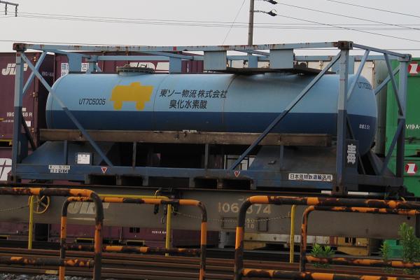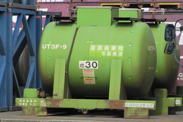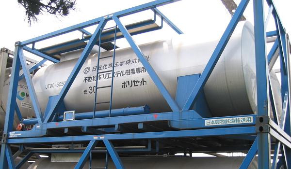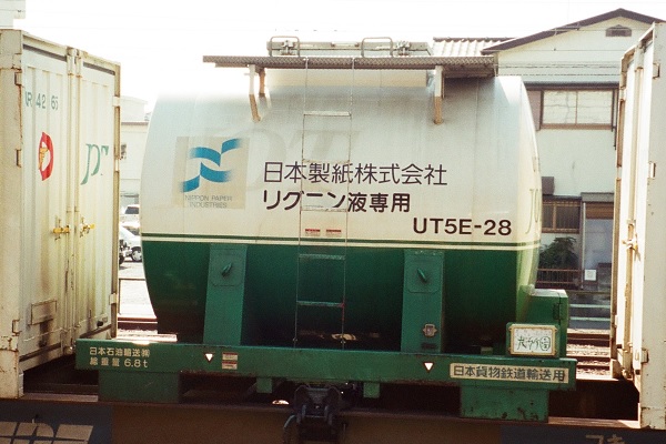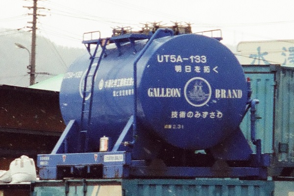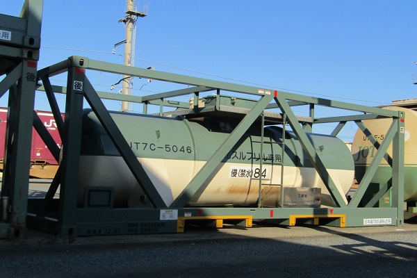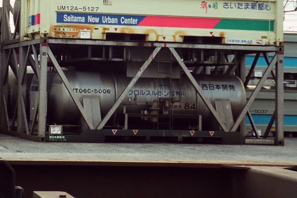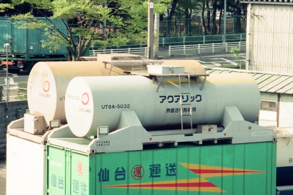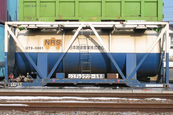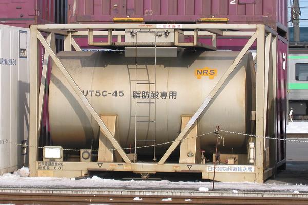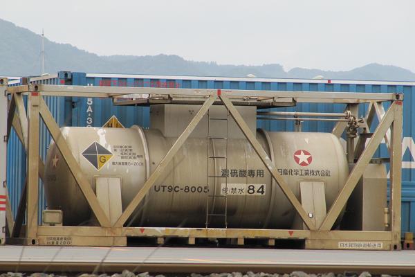 有者】 日本陸運産業株式会社 【借受者】 日産化学工業株式会社 【輸送品目】 濃硫酸専用 【運用区間】 名古屋(タ)・富山貨物〜福岡(タ)・盛岡(タ)(タ ンク体の表記はこちら) 【その他】 日産化学工業(株)と言えばかつてタンク車を用いて速星駅から全国各地に化成品輸送を行っていたが、現在はタンクコンテナで全国各地に化成品を運んでい る。 盛岡(タ)駅に到着する分は、かつて花巻空港駅の日本重化学工業(株)専 用線に到着していた速星駅発の濃硫酸専用タンク車がコンテナ化されたものであると思 われる。 発駅が速星駅の専用線内における車上荷役ではなくて、富山貨物駅に変更されてしまったのが些か残念ではある。 2012.7.3作成