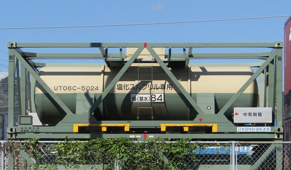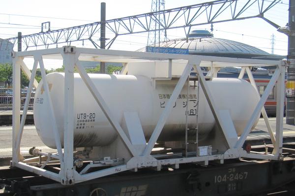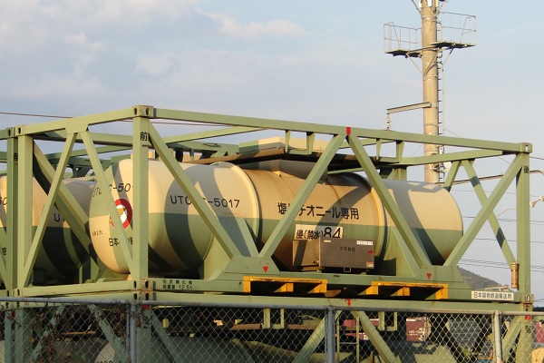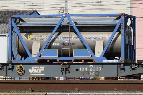 有者】 日本陸運産業株式会社 【借受者】 エア・ウォーター株式会社 【輸送品目】 ピリジン専用 【運用区間】 北九州(タ)〜関東方面か? 【その他】 タールファイン製品であるピリジンは、新日鉄住金化学(株)とエア・ウォーター(株)の合弁会社である(株)シーケムの九州事業所で製造されていると思 われる。 尚、本コンテナは、元は新日鐵化学(株)が使用していた。 しかし2018年4月7日付で、エア・ウォーターは、新日鉄住金化学にシーケムの持ち分株式を全て譲渡して合弁事業を解消すると発表した。更に2019 年4月1日付で当該ケミカル関連事業を新日鉄住金(株)及び新日鉄住金化学に譲渡する。そのため本コンテナの使用者にも変化が訪れるかもしれない。 2018.12.2作成