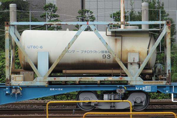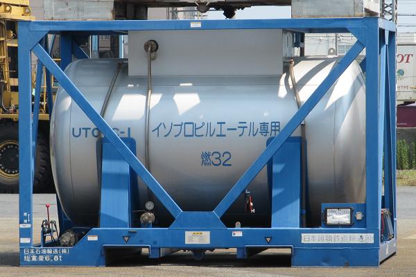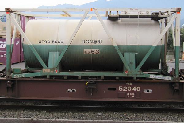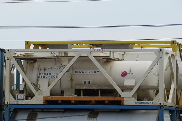 有者】 株式会社エム・ティー・ビー 【輸送品目】 DCN専用 【運用区間】 千葉貨物〜新居浜と思われる 【その他】 DCNとはジシアノノルボルナン88%、トルエン8%であることがタンクコンテナ側面に表記されている。 2012.7.14作成