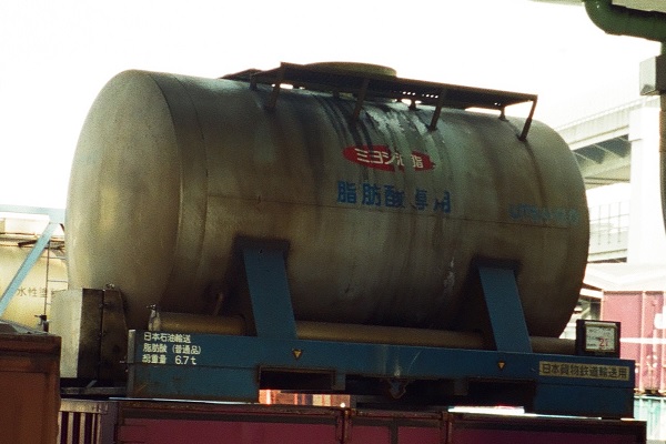 有者】 日本石油輸送株式会社 【借受者】 ミヨシ油脂株式会社 【輸送品目】 脂肪酸専用 【運用区間】 神戸港〜東京(タ) 【その他】 ミヨシ油脂(株)の神戸工場は兵庫県神戸市長田区苅藻通7-1-48にあり、各種脂肪酸を製造している。 2012.6.30作成 2012.7.16訂補