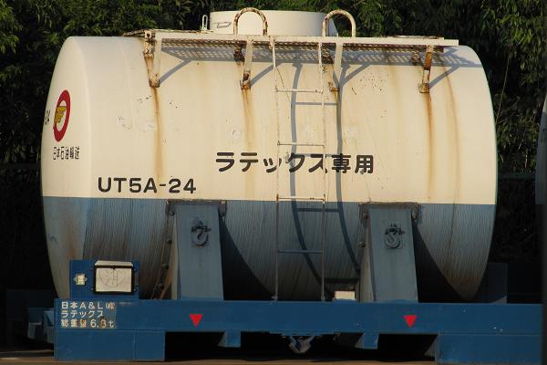 有者】 日本石油輸送株式会社 【借受者】 日本エイアンドエル株式会社 【輸送品目】 ラテックス専用 【運用区間】 京葉久保田〜富士など 【その他】 日本エイアンドエル(株)(日本A&L)は、1999年7月に住友化学(株)が85%、三井化学(株)が15%を出資して設立されたABS樹脂 及びSBRラ テックス等の製造・販売を行う会社である。 工場は千葉、大阪、愛媛にある。 2012.7.19作成