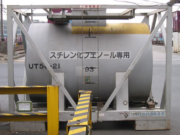 有者】 日本石油輸送株式会社 【借受者】 川口化学工業株式会社と思われる 【輸送品目】 スチレン化フェノール専用 【運用区間】 隅田川〜四日市 【その他】 川口化学工業(株)は有機ゴム薬品メーカーとして、タイヤ及び各種ゴム製品メーカーを中心に加硫促進剤、老化防止剤、加硫剤などの各種化学薬品を供給し てい る。 スチレン化フェノールは主に老化防止剤に用いられる。 同社は埼玉県川口市領家4-6-42に川口工場がある。 2012.7.7作成