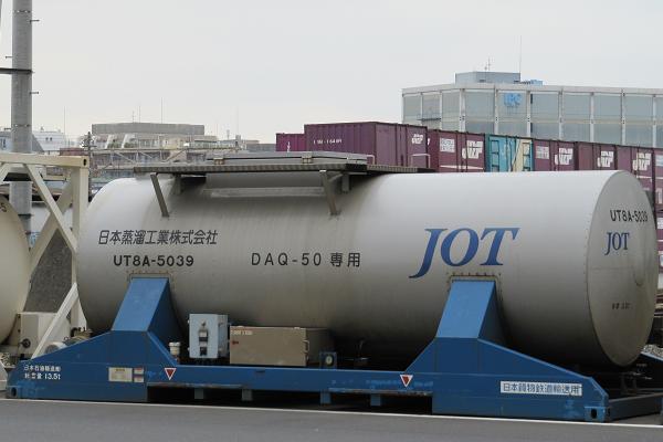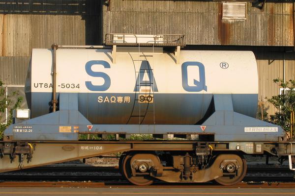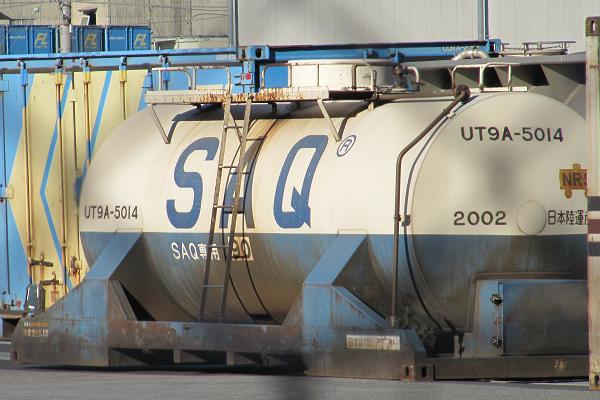 有者】 日本陸運産業株式会社 【借受者】 川崎化成工業株式会社 【輸送品目】 SAQ専用 【運用区間】 隅田川〜八戸貨物などと思わ れる 【その他】 川崎化成工業(株)は三菱化学グループの化学メーカーで、世界有数 のキ ノンメーカーであり、業界大手の地位にある無水フタル酸を中心とした有機酸類メーカーとして、各種誘導体を開発・製造している。事業所は川崎工場が千鳥と 塩浜の2地区に存在している。 SAQはキノン系製品の1つでパルプ蒸解助剤の同社のブランド名である。同社のSAQ専用のコンテナとしてはUT8A-5034も あり川崎貨物〜高岡貨物で運用されているようだが、隅田川駅で目撃したこのコンテナは東北地方で運用されている模様。例えば八戸貨物駅で目撃したSAQコ ンテナを直後に三菱製紙(株)八戸工場内で見かけたことがあ るので、東北地方の紙パルプメーカーの納入に鉄道コンテナ輸送を活用しているものと思われる。 2014.1.12作成