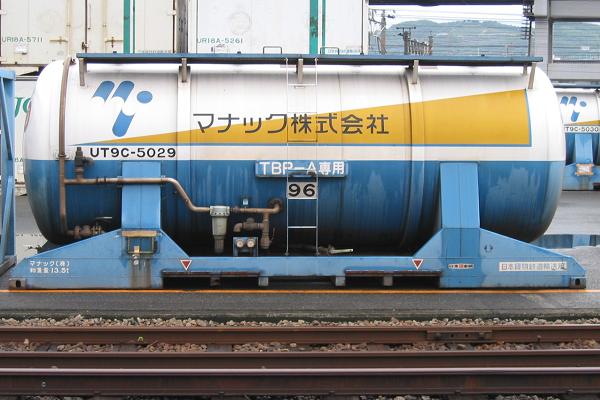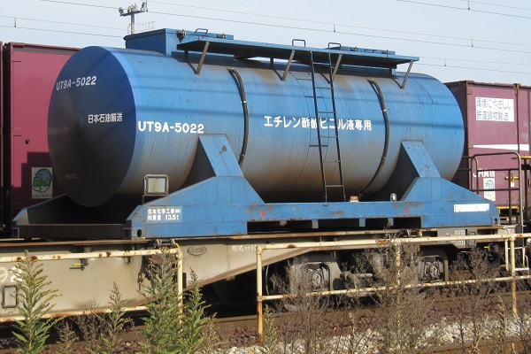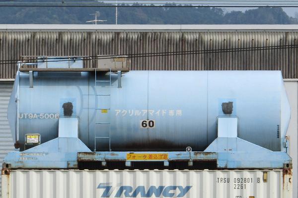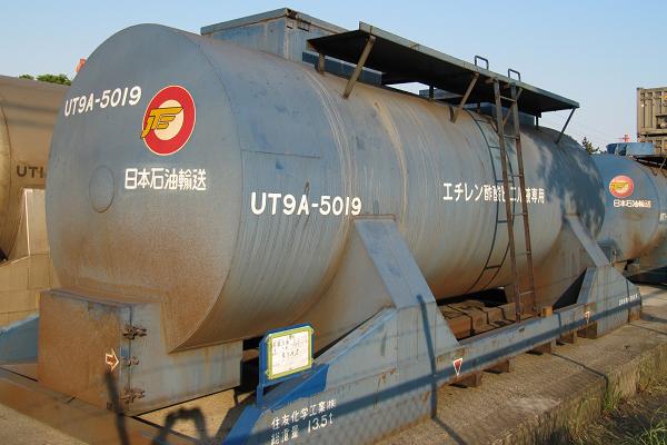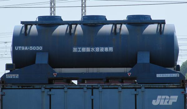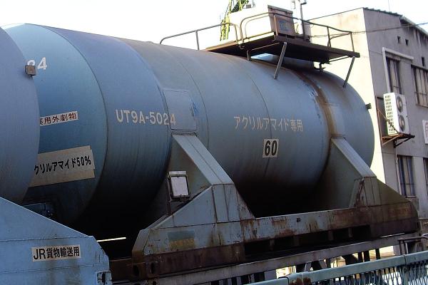 有者】 株式会社エム・ティー・ビー 【輸送品目】 アクリルアマイド専用 【運用区間】 千葉貨物〜秋田貨物など 【その他】 2006年8月に秋田市内でUT9A-5023を目撃した際は、千葉貨物〜秋田貨物の運用であった。三井化学(株)茂原分工場はアクリルアマイドを生産して いる。アクリルアマイドの主な用途は、高分子凝集剤や紙力増強剤である。そのため三井化学(株)茂原分工場から日本製紙(株)秋田工場向けの輸送と思われる。 一方でUT9A-5024は梅田駅を拠点に運用されている模様。 2014.1.12作成