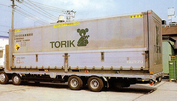有者】 株式会社トーリク 【運用区間】 新座(タ)〜浜小倉 【その他】 (株)トーリクは照明関係の自動車部品の一部を私有大型コンテナに切り替えた。これらの部品は特殊なボックスパレットに入っており、ウイングルーフ形式 のコ ンテナを採用された。復路も空パレットやその他の製品を輸送する。 (参考文献:『Monthlyかもつ』1991年9月号) (株)トーリクは本社は神奈川県平塚市、資本金218百万円、年商 42億 円の物流会社である。同社の主要株主、主要取引先には自動車向けランプの大手メーカーである市光工業(株)があり、このコンテナは同社のランプを日産自動車(株)に供給 するため に利用されていたと思われる。ただ同社の事業所は群馬県の藤岡製造所、大泉製造所(2009年閉鎖)などにあり、新座(タ)駅が最寄りとは言えないが当時 は倉賀野駅では30ftコンテナの取り扱いが不可能だったため、新座(タ)駅を利用していたと考えられる。 2015.10.17作成