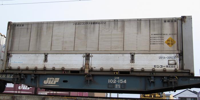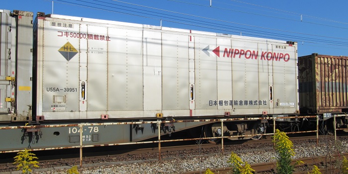 有者】 日本梱包運輸倉庫株式会社 【運用区間】 福岡(タ)〜新座(タ) 【輸送品目】 オートバイ 【その他】 日本梱包運輸倉庫(株)は1989年にオートバイを2段積みできる背高31ftコンテナを開発した。熊本県の本田技研工業 (株)熊本製 作所で製造されたオートバイを日本梱包運輸倉庫(株)のオートバイの物流センターとなっている狭山ターミナル営業所へ輸送するために用いられている。 (参考文献:『Monthlyかもつ』2007年9月号) 2015.9.20作成
