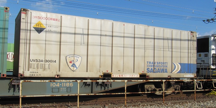 有者】 全国通運株式会社 【借受者】 佐川急便株式会社 【運用区間】 東京(タ)〜福岡(タ)など 【その他】 佐川急便はかつてはUV56A形式やUV57A形式を利用して いたが、現在は容積が若干小さいUV53A形式に更新されたようだ。 2019.8.4作成